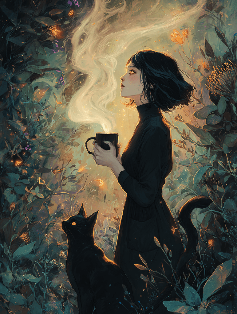 Steam billowed from the hot mug of coffee as the chill of the pre-dawn air rushed through the open back door. Dili took a deep breath, enjoying the rich aroma rising to her nose as much as the fragrant smells of her garden beyond. She felt a brush of fur against her leg as the black cat who’d chosen her darted out into the darkness.