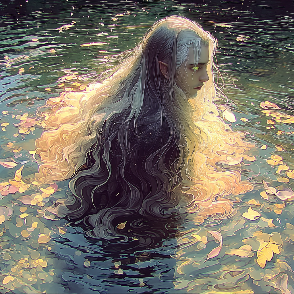 Before Toad could turn around, splashes burst from the center of the pool. A face paler than cotton and as thin as withered reeds broke the surface. Dili noted the white-gold hair fanning out around him, nearly three feet long. The water was so clear that Dili could have seen much more than that, but the way the dappled sunlight played across those pink lips mesmerized her to the point of stunned silence.